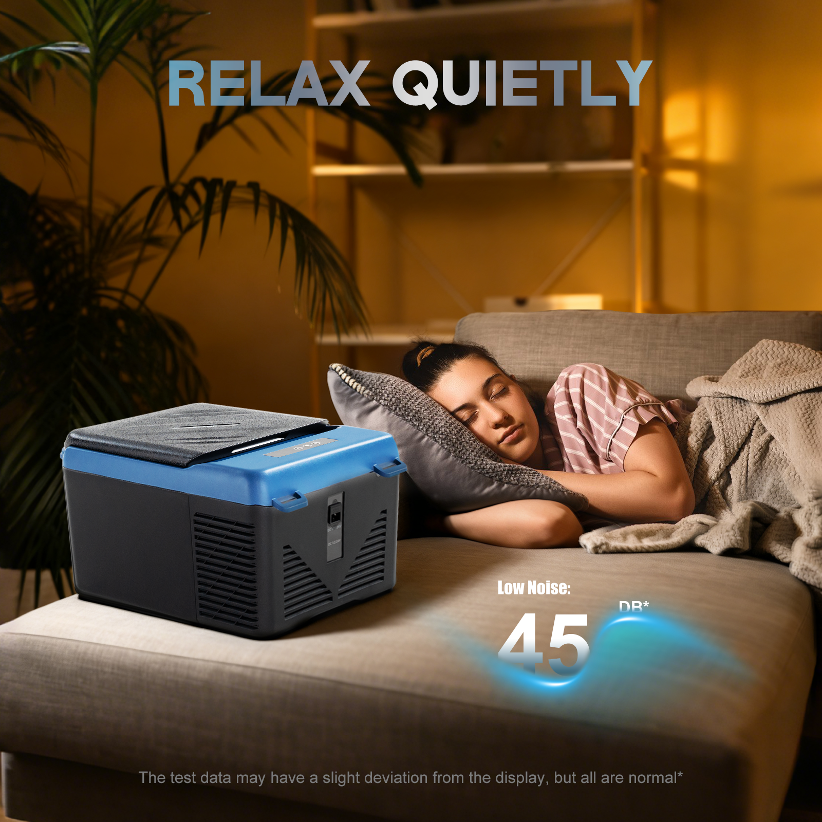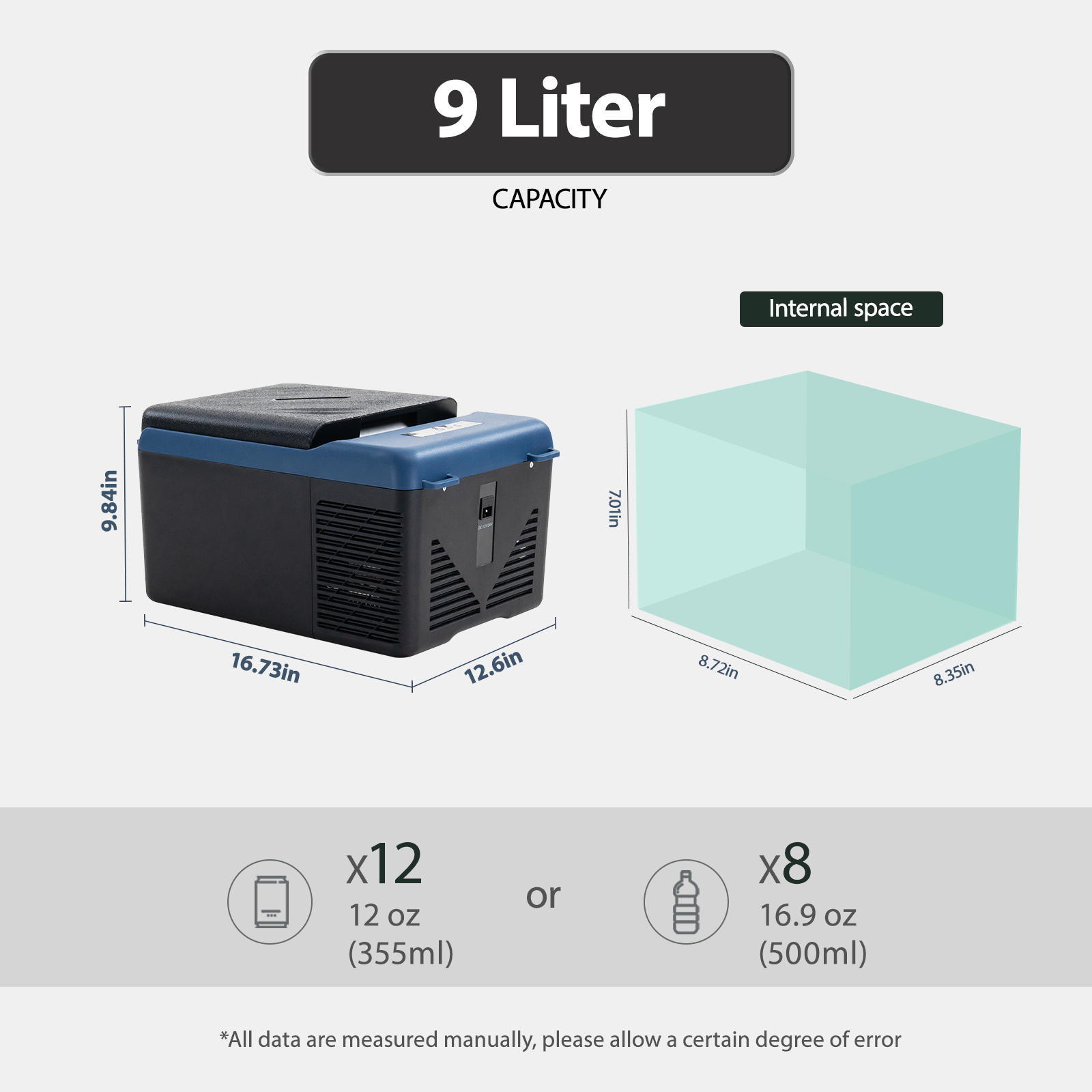This 10QT (9L) portable 12V cooler works as both fridge and freezer, powered by an advanced compressor that cools quickly from 68°F to -4°F with fast‑cooling and energy‑saving modes. It uses fluorine‑free, efficient insulation and features a sturdy, vibration‑resistant build that maintains stable performance on slopes, ideal for trucks, campers, SUVs and outdoor activities.