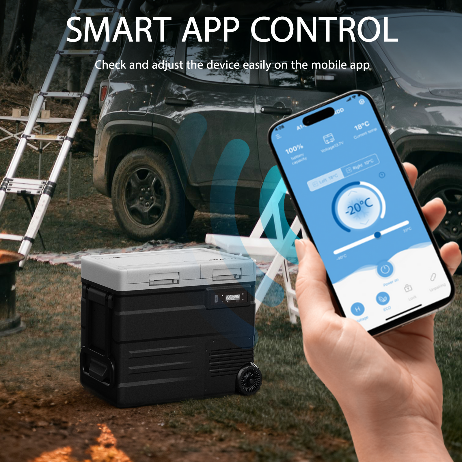 It has multi-stage battery protection and temperature memory, supporting DC/AC power and optional solar input. Rugged for all terrains, it maintains stable cooling on slopes and comes with wheels and a pull handle for easy portability.